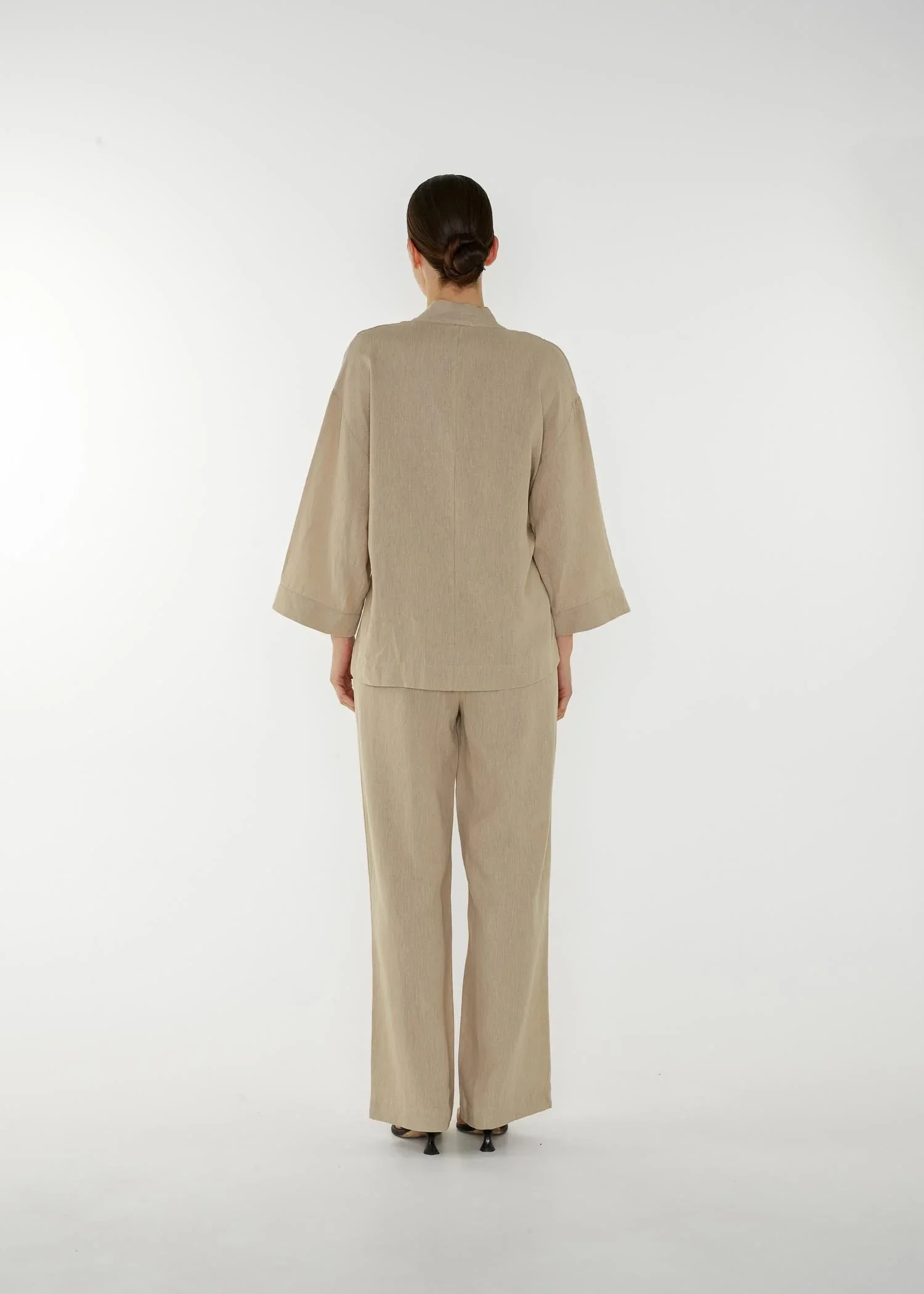 Verrijk je garderobe met deze minimalistische linnen kimonotop, ontworpen voor moeiteloze verfijning. Gemaakt van hoogwaardig, ademend linnen, heeft hij een flatterend wikkelmodel met een tailleband voor een pasvorm op maat. Het materiaal bestaat uit 45% linnen en 55% viscose. Het model is 176 cm lang en draagt maat S.