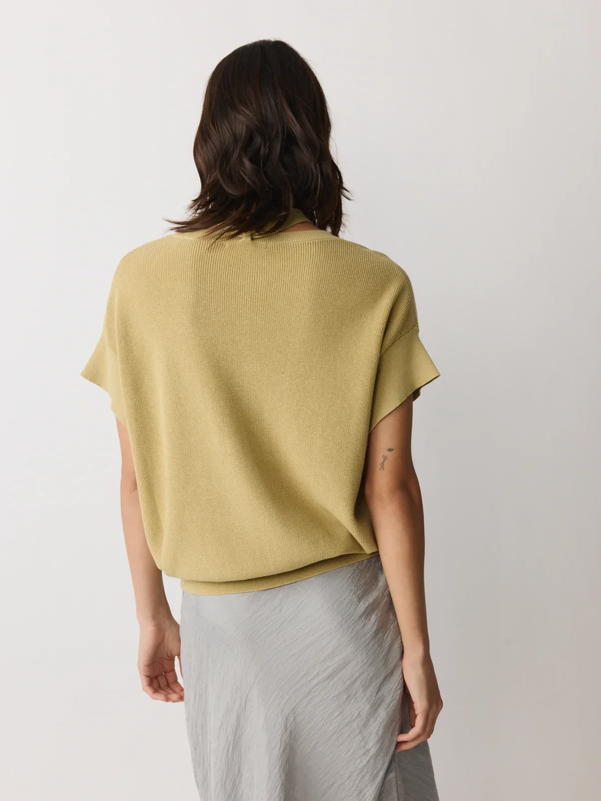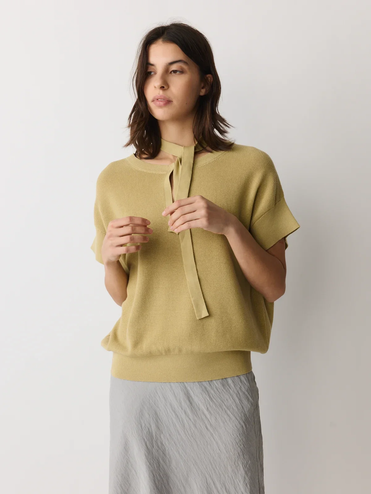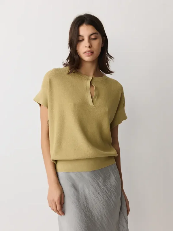 Deze mouwloze gebreide top, gekenmerkt door zijn vorm, combineert een relaxte pasvorm met een getailleerde taille. Gebreid van een katoen-linnenmix in een lichtgouden kleur met groene ondertonen. Afgewerkt met een V-hals, korte mouwen, een haak-en-oogsluiting en een afneembare strik.